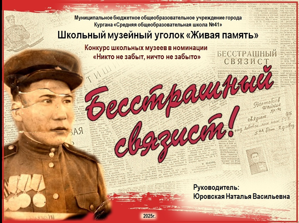 В нашем музее собраны уникальные экспонаты. Среди них — ценные материалы из семейного архива учителя математики Айжан Шайкиловны Джусуповой, которая более десяти лет работает в нашей школе. Она поделилась документами, фотографиями и газетными вырезками, посвящёнными своему отцу —ветерану Великой Отечественной войны Балтобаеву Шайкил Шакеновичу. Используя эти материалы в 2025г. мы приняли участие в городском конкурсе школьных музеев города Кургана «Школьный музей в образовательной среде» в номинации «Никто не забыт, ничто не забыто», где завоевали первое место и звание победителя. Вот наша работа - /netcat_files/userfiles/2526_uchgod/muzey/SOSh_41_Besstrashnyy_svyazist_1.pdf